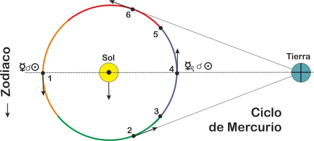 Trataremos de explicarlo en el siguiente gráfico, que muestra el giro, en sentido antihorario, de Mercurio alrededor del Sol; comenzando desde la posición 1 hasta la 6 y cerrando de nuevo en la 1.