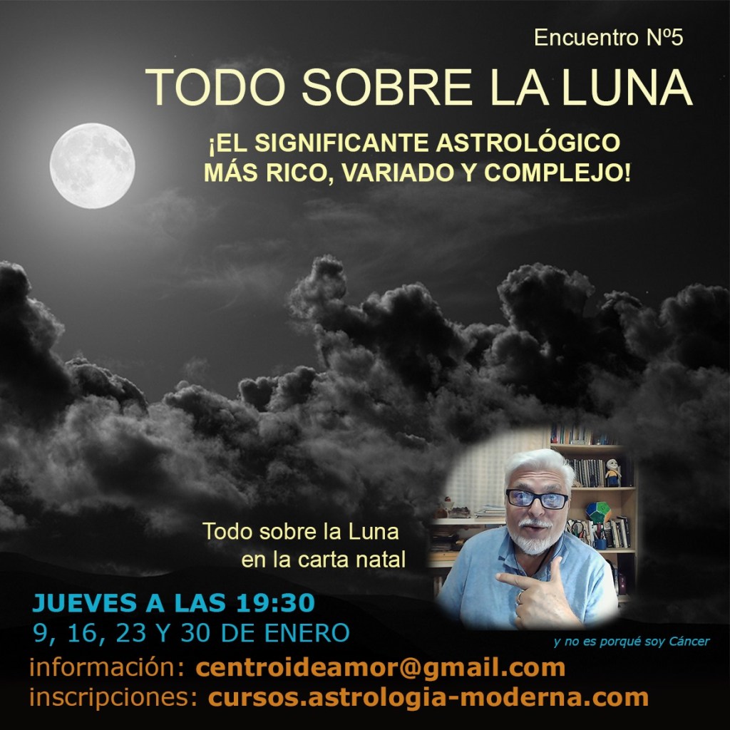- Clase 4, enero 30. La Luna y los aspectos con otros planetas. Aspectos difíciles a la Luna y sus consecuencias. Consideraciones sobre la polaridad de los planetas que aspectan a la Luna. La Luna sin aspectos y la Luna muy aspectada.